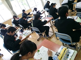 B組は理科の授業。先生からルーペの使い方の説明を聞いた後、それぞれ採集してきた植物をスケッチしました。みんな一生懸命、ていねいにスケッチと解説を書いていました。