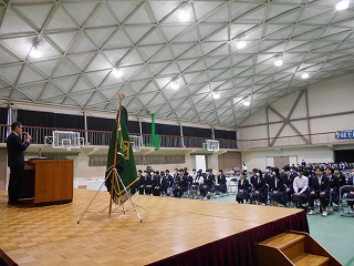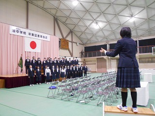 今日の2限目には、はじめて「卒業式全校練習」を行いました。はじめに、校長より「厳粛な式の意味」について話しをしました。続いて、生徒指導担当より「全校で心も体も1つにして、卒業式を成功させるための心構え」について説明をしました。その後は、国歌、校歌、式歌の練習を3学年そろって行いました。はじめての練習でしたが、しっかりと大きな声で歌うことができました。