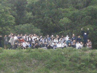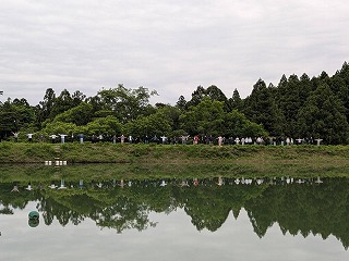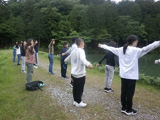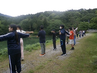 おはようございます。眠そうな目をこすりながら起きてきた1年生の皆さん、昨夜はよく眠れましたか? 自然教室2日目の朝はラジオ体操から始まります。みんなで大門池の畔まで移動し、心地よい朝の空気を吸いながら、一列になってラジオ体操。さわやかな朝の始まりでした。