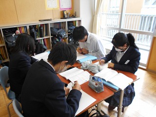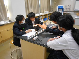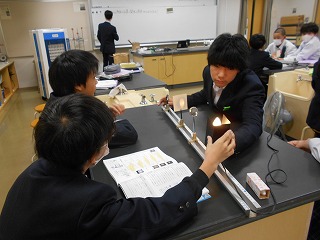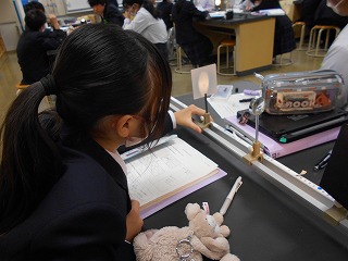 今日の1年生の理科では、「像の大きさと物体の位置関係を説明できる」というめあてで実験を行いました。光を通したレンズからみえる影の特徴を、班内で話し合って、「どうしてそのように見えるのか?」について、考察を深めました。