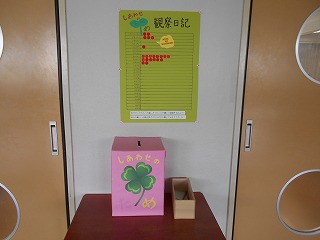 2年生の廊下には「しあわせの観察日記」が掲示されていました。これは、「自分がしてもらってうれしかったこと。」「誰かのやさしい行動をみかけたとき。」に、赤いシールを貼って、その内容を書いたメモ用紙をしあわせBOXに入れていく仕組みです。当たり前に生活できていることが、誰かの優しさに包まれて生きていることに気づいていけたなら、心を温かくして学校生活を送ることができますね。