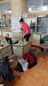 【YEF(四日市市英語指導員)のオライオンさんは、掃除中、掃き掃除を丁寧に行ってくれています。】