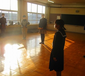 本日、2・3年生の美術科の授業で作成してもらった色紙を神前地区の民生委員の方々にお渡しする会が神前小学校で行われました。(神前小学校は折り鶴(この折り鶴は色紙にはってもらっています。)を、三重平中学校は年賀状を作成してもらっています。)今後、民生委員さんを通じてお年寄りの方々へ配られることとなります。会のなかでは、三滝中学校を代表して福祉委員会委員長がしっかりとしたあいさつをしてくれていました。