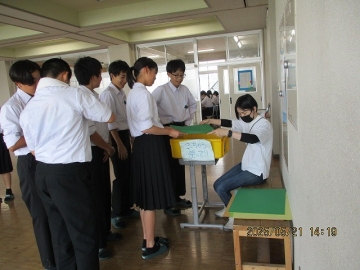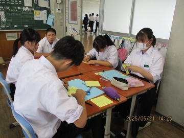 3年生は三滝中名物、班ポスター作りです。テーマは「梅雨~夏」だそうです。「俺、画用紙もらってくる~♪」とフットワーク軽くホールに向かう子、どんなモチーフを使ってテーマを表現しようか話しあう子、さっそく作り始める子、それぞれの良さが光っていますよ!