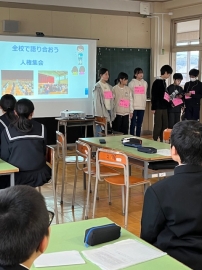 まずは各校の人権学習の取り組みをまとめたものを、プレゼン形式で発表しました。小学生が原稿を見ずにはっきりと伝える様子に驚き、また人権学習によって自分たちを見つめなおしていった報告に感心し、刺激を受けていました。