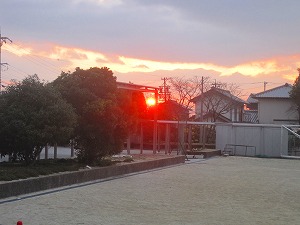 今日は、太陽が顔を隠(かく)すことが多く、昼間でも寒さを感じる一日でした。皆(みな)さん、体調は崩(くず)していませんか?今朝、昇降口付近から東のほうを見ると、きれいな朝日が見えたので写してみました。(個人的には、朝日や夕日がきれいに見えると得した気分になります。)
