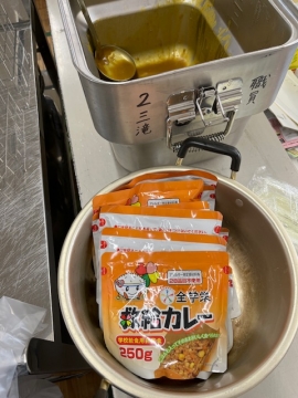 連絡を聞いて、そのカレーを確認したところ、すこぶる冷たい!このまま食べてもらうにはあまりにも厳しいと考え、職員室にいる先生たちを総動員して、約500食になるカレーを湯煎することにしました。合計三ヶ所でグツグツして、なんとか食べやすくなったかと思います。