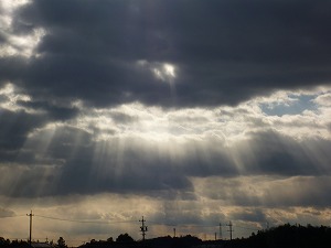 昨日、夕方ころの空です。雲の隙間(すきま)から光がさしていました。きれいだったので写しました。これも薄明光線(はくめいこうせん・別名『天使のはしご』)でしょうか。