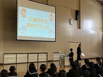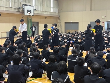 対面式では、生徒会会長からの挨拶と、1年生代表の松田さんからの挨拶がありました。また、学校生活にまつわるクイズと教室を飾る花の贈呈がありました。