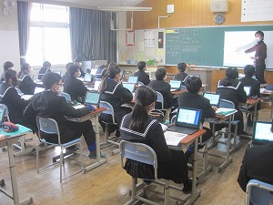 タブレットを活用して『地震』について学習していました。自分の考えをプリントに記入し、それをタブレットを使って撮影したのち、教師用のパソコンへ写真データを提出(送信)していました。提出された写真データをスクリーンへ映し出し、学級の仲間の考えを知ることができました。