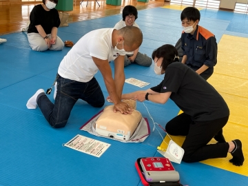 胸骨圧迫の心臓マッサージや、AEDの使用方法を教えてもらいました。