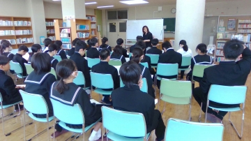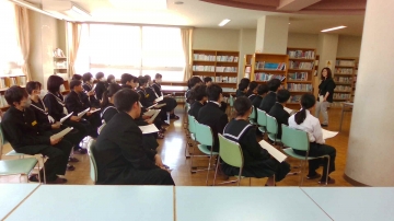 1年生の国語の授業で、図書室において司書の下田さんより「ブックトーク」が行われました。