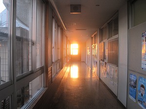 ちょうど校舎1階東出入口の正面に朝日が出ていて、このような光景が見られました。