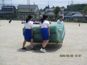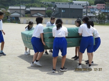 【脳内実況中】さあ、楽しかった体育も終わり。いよいよ片付けが始まりました!おっと~、この重いマット、この人数で運べるのか…大丈夫でしょうか?ここは日ごろ培っている「かかわる力」を見せてほしいですね。