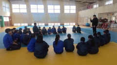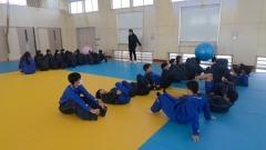 2時間目は武道場で体を動かしながら、クラスで協力して取り組むワークでした。鬼と同じマスに入らないよう動いたり、ペアで足を合わせてボールを落とさないようリレーしたり、クラス全員で輪になって割りばしを落とさないようミッションをクリアしたりと様々なワークに取り組みました。特に最後の割りばしのワークでは、最初は楽しくワイワイしますが、なかなかクリアできず何度も繰り返すうちに、失敗を責める声やイライラした雰囲気が出始めます。そんなマイナスの空気がをいかに断ち切り、プラスの声かけや作戦を共有していけるかが成功のカギとなりました。