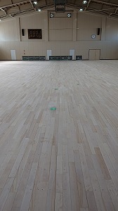 【体育館の改修工事真っ最中(さいちゅう)です。床をきれいにしていただきます。】
