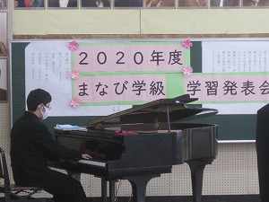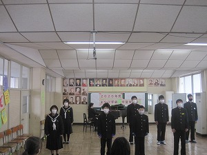 さて、今日は1限目に『まなび学習発表会』が音楽室で行われました。まなび学級の生徒が、これまで取り組んできた合唱等の成果を発表しました。全学年で『翼をください』『旅立ちの日に』を合唱した後、3年生による『あなたへー旅立ちに寄せるメッセージ』の合唱がありました。しっかりと声を出し、聞いていてもとても気持ちのいい合唱でした。また、1・2年生から3年生へのお礼の言葉や3年生から後輩、家族へ向けたメッセージもありました。