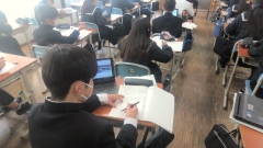 後半はキャリアパスポートの記入を行いました。今年度取得した資格や部活での功績を記入しました。4月に記入した1年間の目標を達成できたか否かを振り返り、今年度の自己を見つめる時間となりました。