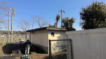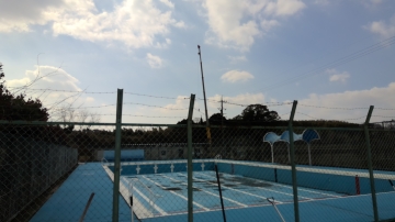 西朝明中学校のプール周辺では、プールろ過機の更新、トイレの改修、プール付近の樹木剪定と工事車両がたくさん行きかいました。