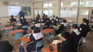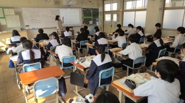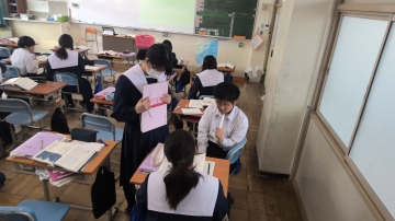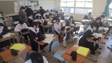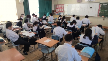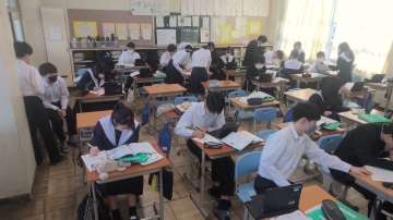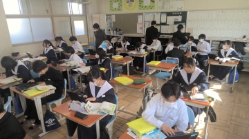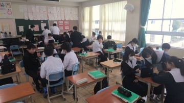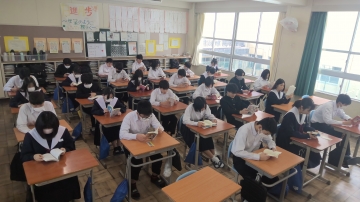 3年生は私立高校の入試真っ最中です。進路相談も兼ねた二者懇談が毎日のように行われていますし、繰り返し面接練習も行われています。生徒たちも休み時間も学習に取り組む姿も見られます。また、少ない時間ながら友だちとの会話の中でリラックスする時間もとっています。6限目には中学3年間で学んだSDGs学習のまとめとして、自分が大切にしたいSDGs18番目の目標を考えていました。