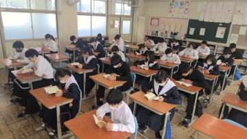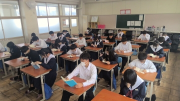 今朝の生徒の様子です。西朝明中学校では登校後朝学活までの時間に朝活動をしています。今日は1・2年生は読書活動を、3年生は3年間の学習を振り返る活動を行いました。