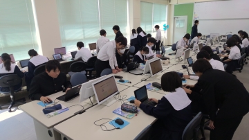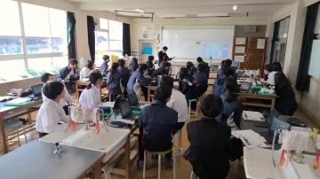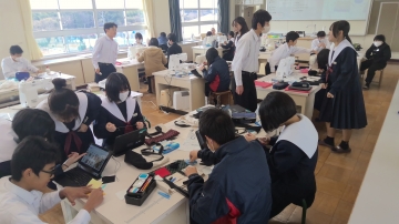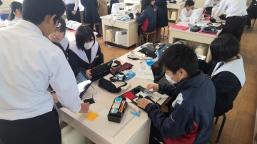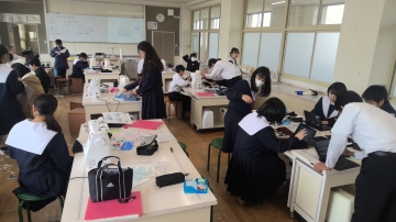1年生の家庭科の時間はトートバックづくり。ここでも自分の進度に合わせて、仲間と交流しながら作業を進めていきます。自分のペースに合わせて進度を調整し、仲間と学びあいながら理解や技能習得を深めていく授業は技能教科では昔から行っていました。座学の授業の中でもこのノウハウの良い部分を取り入れ、ICTの同時双方向性などを利用して、対話的に刺激を受けながら深めていく授業を行っています。