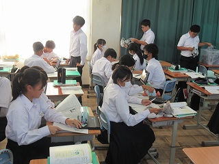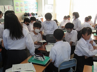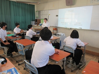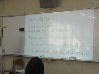 先週から西朝明中学校で英語科教員として教育実習を行っている日沖先生が授業に取り組んでいます。下の写真は先週金曜日に行われた2年生の授業の様子です。授業の主たる部分は must と have to の違いについて。日本語にすれば「しなくてはならない」ですが have to はルールなどの外的要因による“義務的”な状況を表し、must は、自分の意思による“主観的”な表現となるそうです。また must not~は 「~してはいけない」 と禁止しているのに対し、don't have to ~は 「~しなくてもよい」 という不必要の意味になります。 日沖先生は長い期間海外で生活された経歴の持ち主らしく、英語の発音もきれいです。せっかくの機会ですので、英語の勉強以外に、海外で生活した経験を多くの生徒に話していただける機会を持ちたいと考えます。