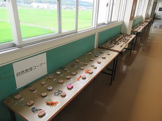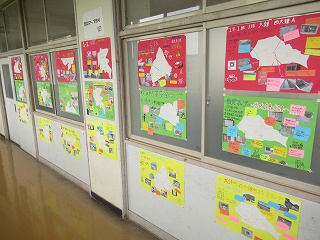各学年の廊下にも、生徒の作品などが掲示されています。懇談の前後にご覧ください。写真は1年生が自然教室で制作した作品と防災@にしあさけで披露した防災環境マップです。