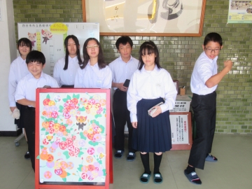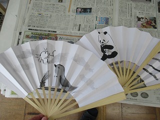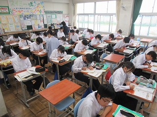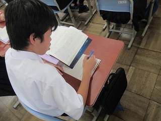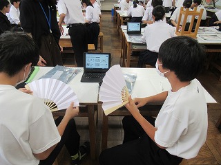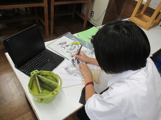 そんな学校の様子から、2年生の美術の授業です。扇子に水墨画を描く内容のようです。生徒は墨の黒一色で描く際に、濃淡を上手に出しながら絵を仕上げていました。扇子に描くということで、山谷があり描きにくそうでしたが中学生らしく工夫を凝らしながら描き上げていました。