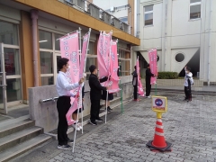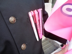 ピンク色の旗を持ったり、ピンク色のペンを胸ポケットにつけたり。。。