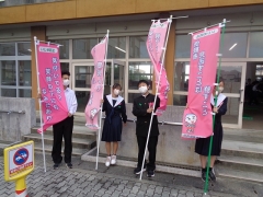 2007年にカナダで始まったピンクシャツ運動をまねて、登校時間帯に、生徒会役員、代議員、専門委員長が「いじめをしない、させない、許さない」といういじめ撲滅のメッセージを発信してくれました。