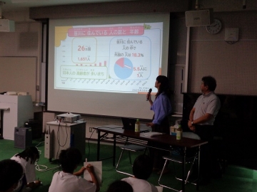 今日は株式会社「ジャパンリビングサポート」のお二人にお越しいただきました。多文化共生についてのお話では、現在、四日市市には69ヶ国約13,200人の外国人の方々が住んでいるとのこと。四日市市民の23人に1人の割合です。それに対して、ここ笹川地区は6人に1人の割合なので、いかに笹川地区に外国人の方々が多いかがわかりますね。