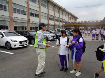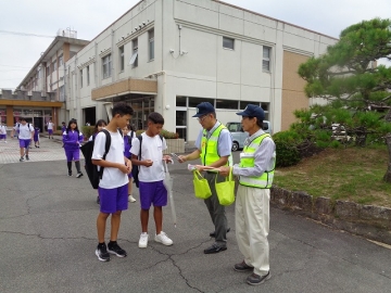 下校時に正門近くで、四日市南地区交通安全協会の方に「反射リストバンド」を配っていただきました。
