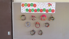 AB組で11月にさつまいも掘りをしました。その後さつまいもの「つる」を使って、クリスマスリースを作りました。キラキラのテープやポンポン、どんぐりなどを使ってきれいに飾り付けをしました。特別棟1階、昇降口の隣に飾ってありますので、三者懇談会の際によろしければご覧ください。