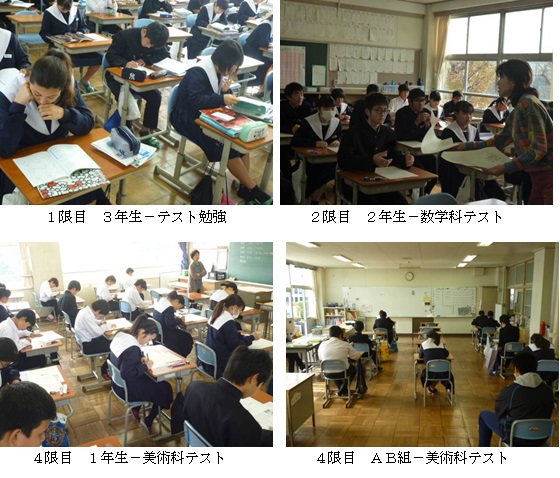 本日26日(月)から2学期末テストが始まりました。 下の写真は、各学級の本日のテスト等の様子です。張り詰めた雰囲気の中で、生徒はテストに集中して取り組んでいました。次のものは明日27日(火)のテスト時間割です。