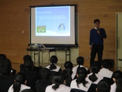 本日、5・6時間目にNPO法人BBフューチャー国際事業部長の阪長さんを講師にお迎えして「世界の人々から学ぶ人生の楽しみ方」と題し、キャリア教育講演会が行われました。 スリランカ・ガーナ・コロンビア・グアテマラ・ドミニカ共和国と世界各地で野球を通じ様々な人々と関わってこられた阪長さんのお話は大変興味深く、生徒・教員ともに前のめりになって聞き入ってしまいました。 スリランカクイズではみんなが「ええーっ!!」と声をあげてしまうようなものばかりで、日本とスリランカの文化の違いに非常に驚かされました。 また、日本語とスペイン語との表現の違いについて、日本語では「私は教科書を忘れた」と言うこともスペイン語では「教科書が私に忘れられた」という表現をするということから、「スペイン語は自分が悪いと思ってないけど、なんだかポジティブにとらえることができる」とお話をしていただきました。 外国の人々と触れ合うことで、本当にたくさんのことが学べ、視野も広がるということを感じさせられました。 そして最後には、阪長さんの「私が使う言葉」として、「きっとできるよ!」「形は変わるかもしれないけど、夢は叶う。」という言葉についてお話をいただき、どんなことにも恐れず自ら進んで物事に取り組むことの大切さを伝えていただきました。 生徒の皆さんも本日の公演を受け、日々の生活で活かしていけるものを見つけることができるといいですね。   |