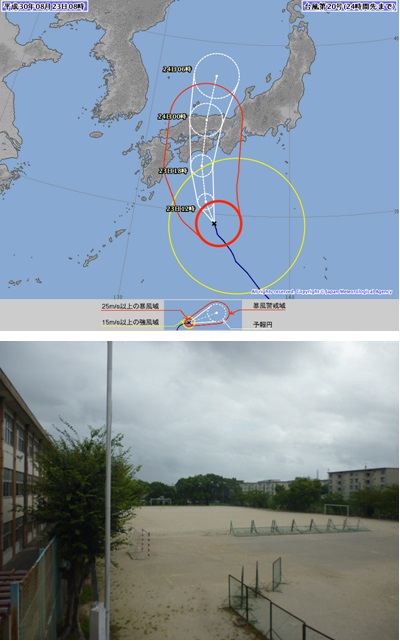 本日8月23日(木)06時37分の津地方気象台の発表によると、非常に強い台風第20号が日本の南にあって、北西へ進んでおり、本日は三重県でも台風第20号の影響で雲が広がり、雨や雷雨となって非常に激しく降る所がある見込みとのことです。 四日市市には本日10時03分に大雨警報、土砂災害警戒警報等が発令され、今後、暴風警報等も発令されることも予想されるため、本校では校内での部活動を中心とした生徒の諸活動は午前中で打ち切ります(一部の午前中の活動はすでに中止しています)。 下の写真は、本日午前8時以降の台風の進路予想図と午前10時過ぎの本校グラウンドの様子です。