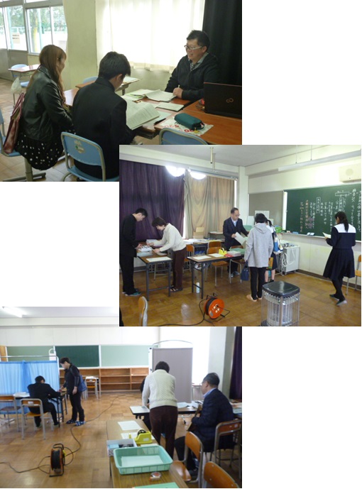 写真中下は、教室での懇談を終えて1階第5少人数教室で受検関係書類(入学願書等)を受け取って記入をする3年生の様子です。