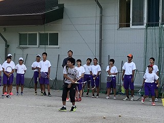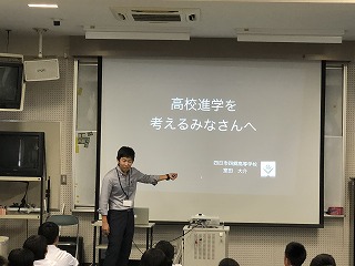 また、6限目には「高校進学を考えるみなさんへ」と題して、入試に向けての心構え等を話していただきました。放課後は、ソフトテニス部に参加し、サーブの打ち方等を指導していただきました。