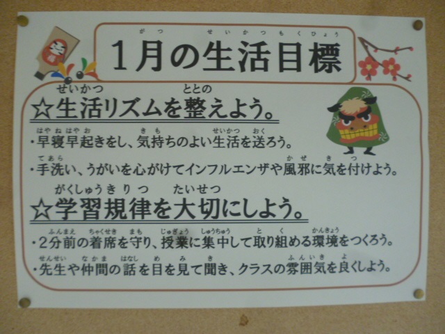 3学期がスタートしてほぼ1週間となりますが、各学年の廊下、教室等に掲示されている生活目標も、下の写真のように新しいものに変えられています。
