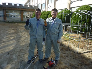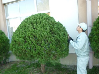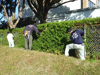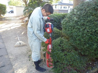 昨日は、先生3人と生徒10人に来校していただき、体育館前のツツジやサツキなどの低木数本とマツ、学校西側の垣根となっているツツジ、サツキやツゲ、技術室周りのカイヅカイブキの剪定をしていただきました。道具は専門的で、スピードもはやく、あっという間にたくさんの樹木がきれいになりました。