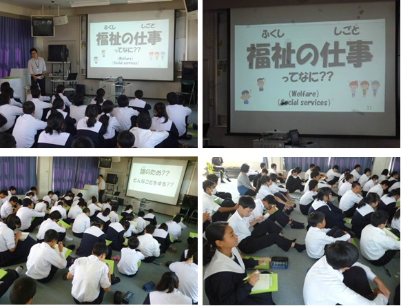 本日24日(水)の6限目、2年生は視聴覚室での総合的な学習の時間にキャリア学習として「福祉の仕事セミナー」を行いました。
