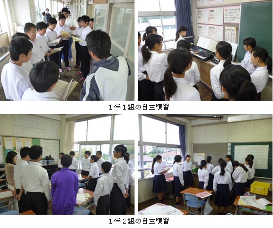 下の写真は、昼休みの1年生教室・廊下での合唱コンクール自主練習の様子です。
