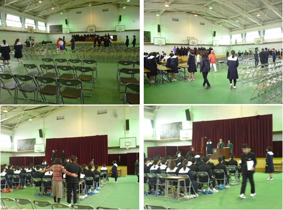 本日4日(月)の1、2限目、2年生が卒業式の会場設営や準備等をしてくれました(写真上左右)。