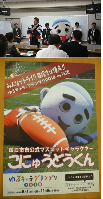 昨日16日(火)に四日市市総合会館で小中校長会議が開かれましたが、冒頭に森市長と本市の公式マスコットキャラクターのこにゅうどうくんが登場しました。 こにゅうどうくんは、今年もゆるキャラグランプリ2018にエントリーしており、現在のランキングは1位となっています。森市長からは、「こにゅうどうくんが、ゆるキャラグランプリ全国1位をめざしてがんばっていることを市内の小中学生にも伝えてほしい」とのメッセージもありました。 なお、ゆるキャラグランプリの投票は現在も受付中で、終了は11月9日(金)18:00となっています。皆さんの応援をよろしくお願いします。
