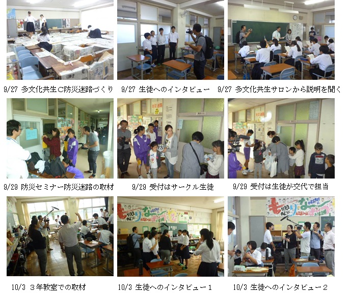 9月末と本日10月3日(水)、本校がNHK津放送局の取材を受けました。 ちょうど、来年度には「平成」にかわって新しい元号となります。NHK津放送局では、「まるっと!みえ」という番組の中で、約30年間の平成の間にあった大きな変化のうち、三重県では外国人住民が増えて多文化共生が進展している地域があることを取り上げるとのことで、笹川地区にある本校も取材を受けることになりました。 まず、9月27日(木)の放課後、NHK津放送局ディレクターの方が来校し、本校の多文化共生サークルが取材を受けました。この日は9月29日(土)の「みんなの防災セミナー2018」に向けて防災迷路づくりの様子を見ていただき、後でメンバーがインタビューを受けました。 次に、9月29日(土)の午前中、本校体育館で開かれた「みんなの防災セミナー2018」で積極的に活動している多文化共生サークルの生徒の様子について取材を受けました。 さらに、本日3日(水)の4限目~昼食~昼休みの時間帯に、外国につながる生徒と日本人の生徒が一つの教室で普通に教科授業を受け、一緒に昼食を取り、楽しく休み時間を過ごしている本校の様子について取材を受けました。 放送は、10月11日(木)18:30~NHK「まるっと!みえ」の予定ということです。ただし、他に大きなニュース等が入った場合、放送は延期されるとのことです。