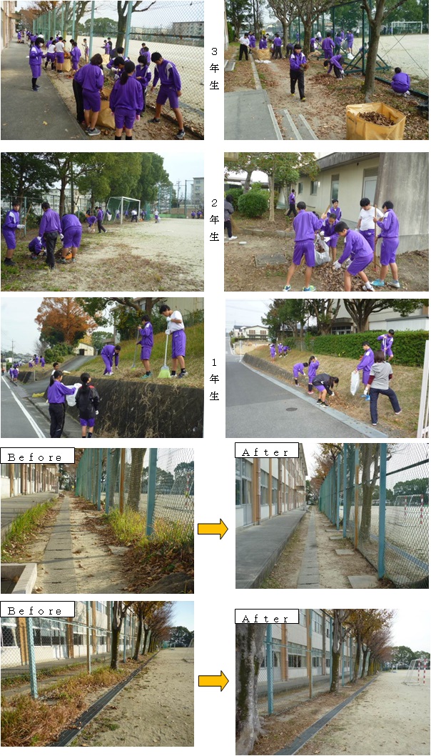 本日28日(水)の5限目、全校で「笹川を美しくする日」の取り組みとして、学校・校舎周りの落ち葉集めを行いました(写真)。