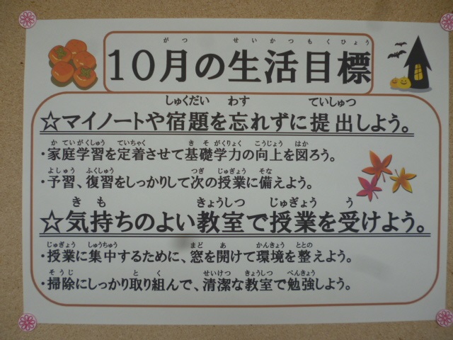 10月に入り、生活目標も新しいものに変わりました。目標の「マイノートや宿題を忘れず提出しよう」と「気持ちのよい教室で授業を受けよう」を意識して学校生活を送ってほしいと思います。