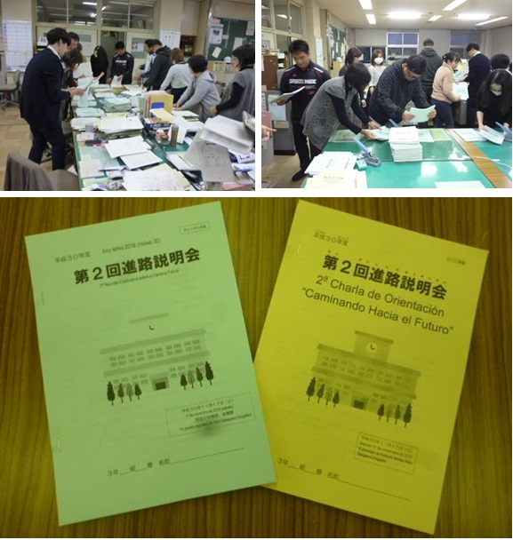 本校では、11月17日(土)に土曜日等の教育活動(土曜授業)を行い、3年生は5~6限に体育館で進路説明会を開きます。 この進路説明会に向けて、現在、各種資料を作成(印刷・製本)していますが、本校には外国につながる生徒が約30%在籍しており、日本語版の他にポルトガル語、スペイン語版の作成も必要です。 昨日12日(月)の夕方には、職員室の教員机の上に印刷したポルトガル語、スペイン語版資料をおいて十数名の教員がページ順に紙を取り製本作業を行いました。ポルトガル語、スペイン語版とも1冊約60枚(120ページ)の分厚い冊子となり、生徒・保護者用として計60冊作成しました。