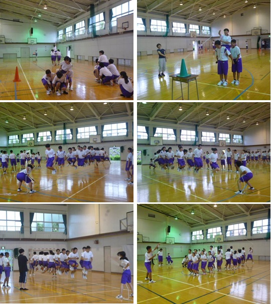 写真上左右は1限目1年生の体育館での学年種目「カウボーイリレー」の練習、写真中左右は3限目3年生の体育館での「大縄跳び」の練習、写真下左右は4限目2年生の体育館での「大縄跳び」の練習の様子です。